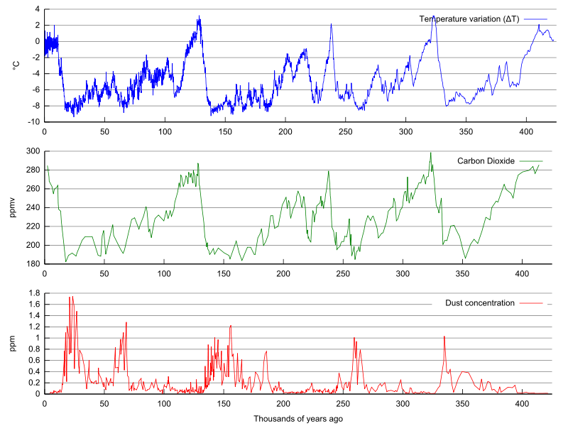 The data indicates that there was a sudden warming starting at about 15, 140, 245, and 330 thousand years ago. The CO² has similar peaks but lags behind the temperature increases by 200 to 600 years. Dust seems to also correlate with the temperature variations, but whether low dust causes warmer temperatures, or warmer temperature cause a cleaning of atmosphere by increased rain, is unknown.